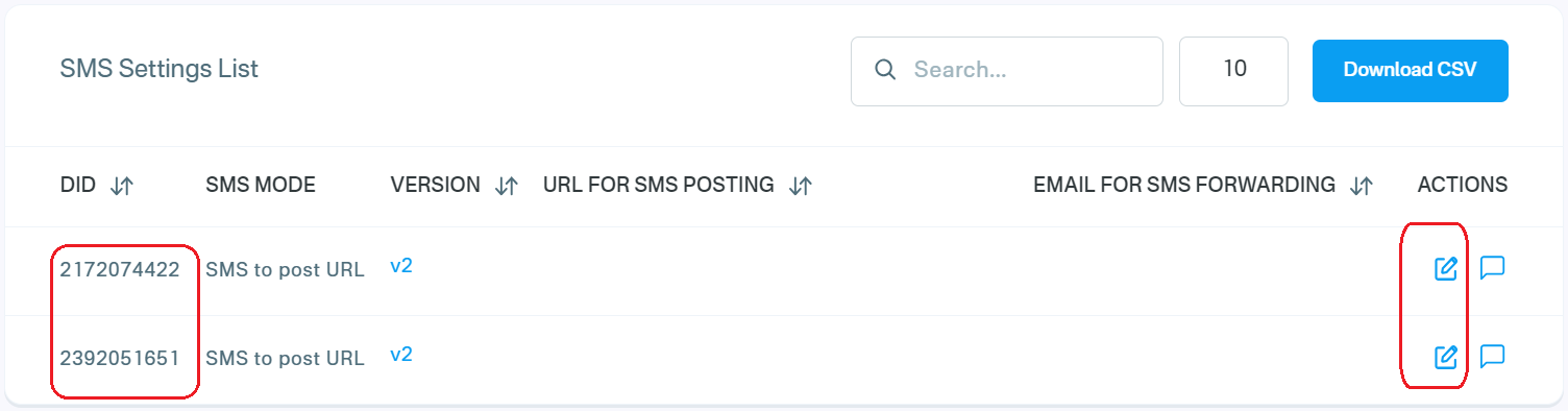 3. Click the **Edit (pencil)** icon next to the DID for which you want to enable SMS.