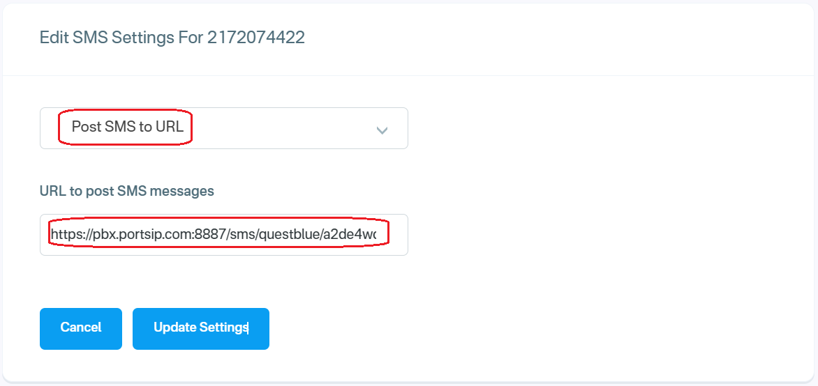 To enable inbound SMS delivery to PortSIP PBX, you must configure the SMS webhook for the DID on the QuestBlue platform.