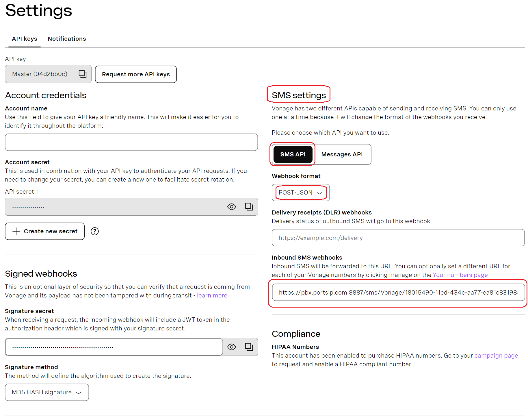 Vonage requires a webhook URL to deliver **inbound SMS** to PortSIP PBX.