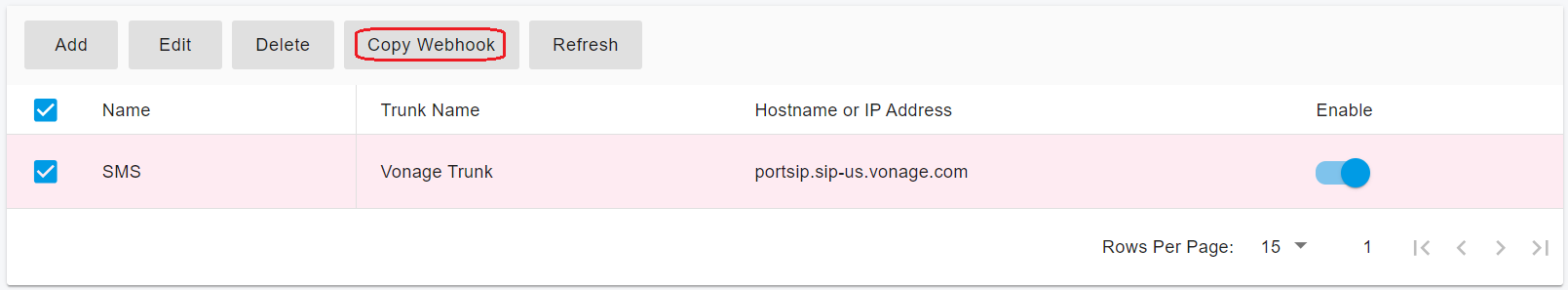 * Select the SMS configuration and click **Copy Webhook**, or