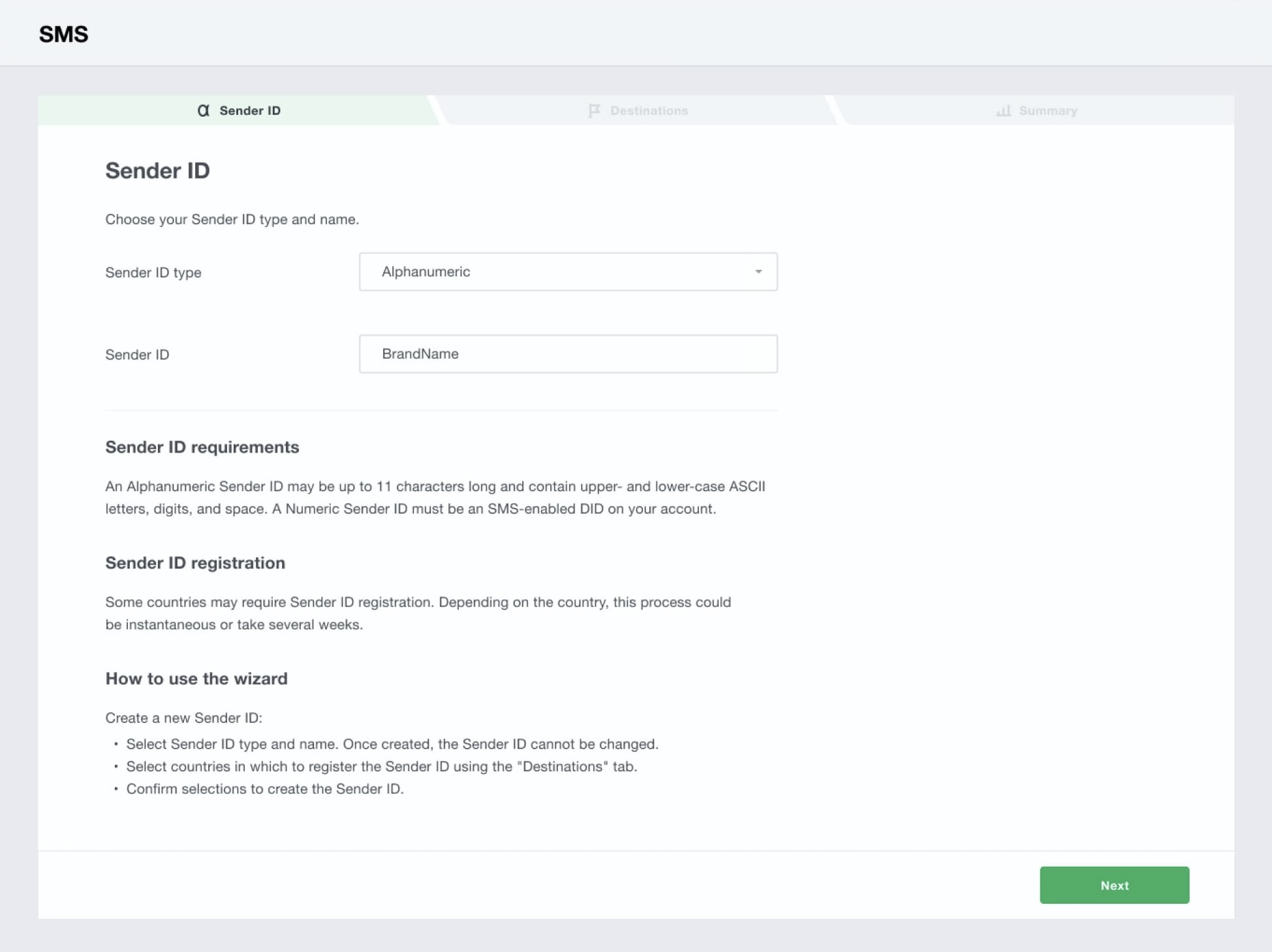 After activating SMS capabilities (if required), you can create a Sender ID to use when sending SMS messages.