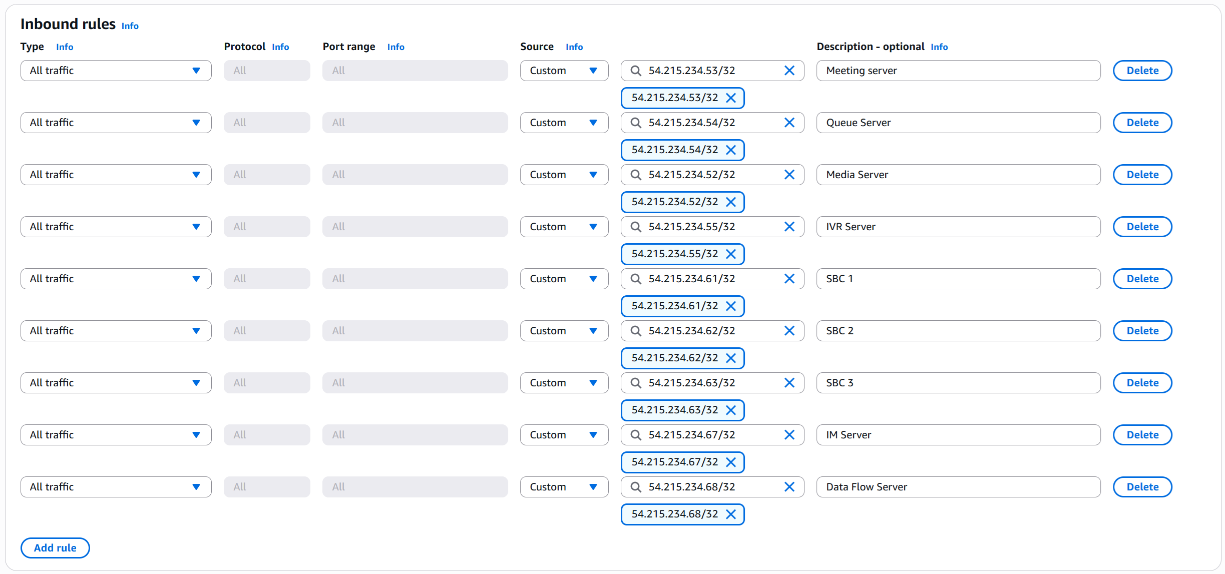 Modify the **Security Group that is attached to all three PBX HA EC2 instances** and add an Inbound Rule that allows traffic from the **Data Flow servers’ Elastic IP** 54.215.234.68 addresses.