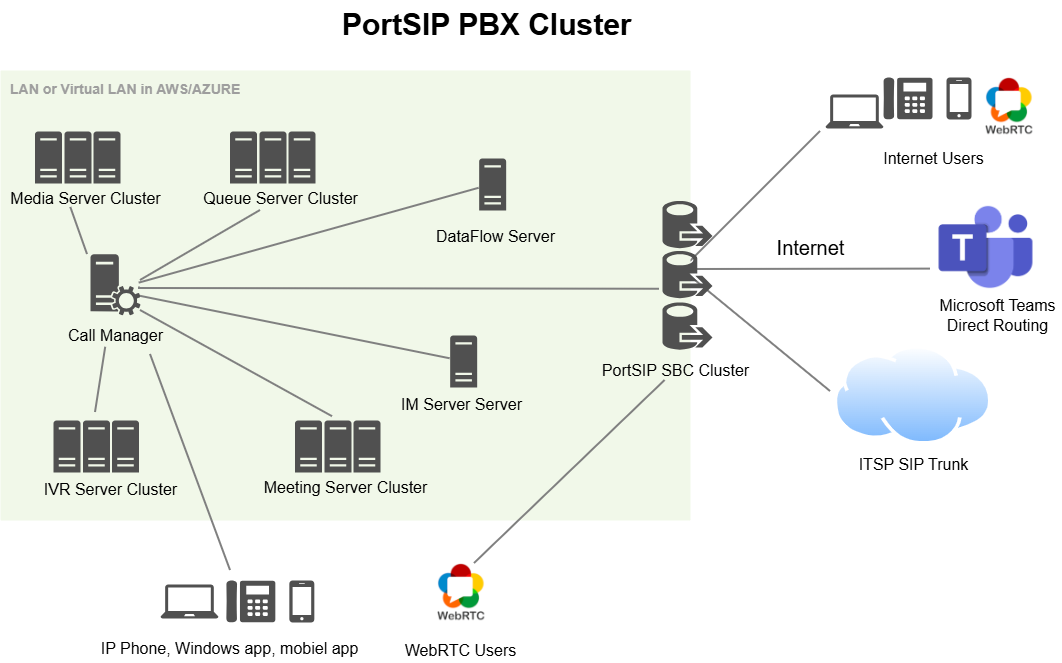 PortSIP PBX is designed from the ground up with a **distributed, service-oriented architecture**. At the core is a centralized **Call Manager**, dedicated exclusively to SIP signaling and call control, while specialized functional servers—such as Media, Meeting, Queue (ACD), IVR, Instant Messaging, and DataFlow—operate independently and scale horizontally as a cluster.