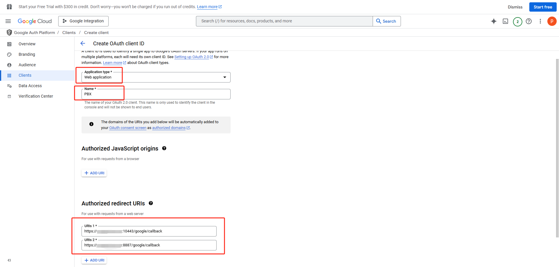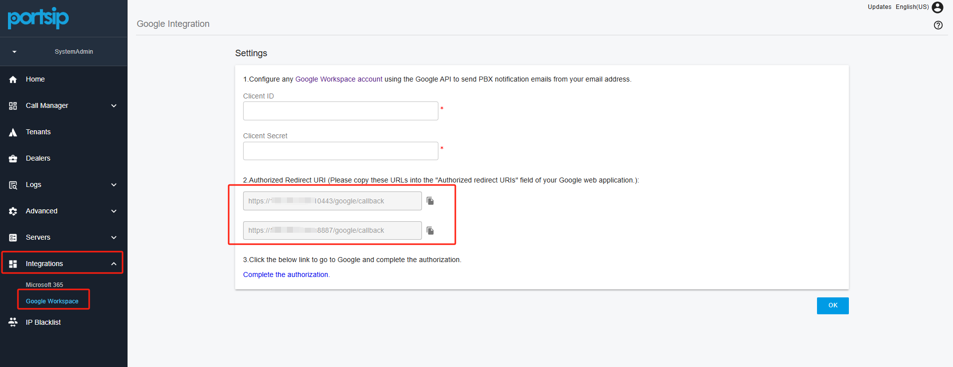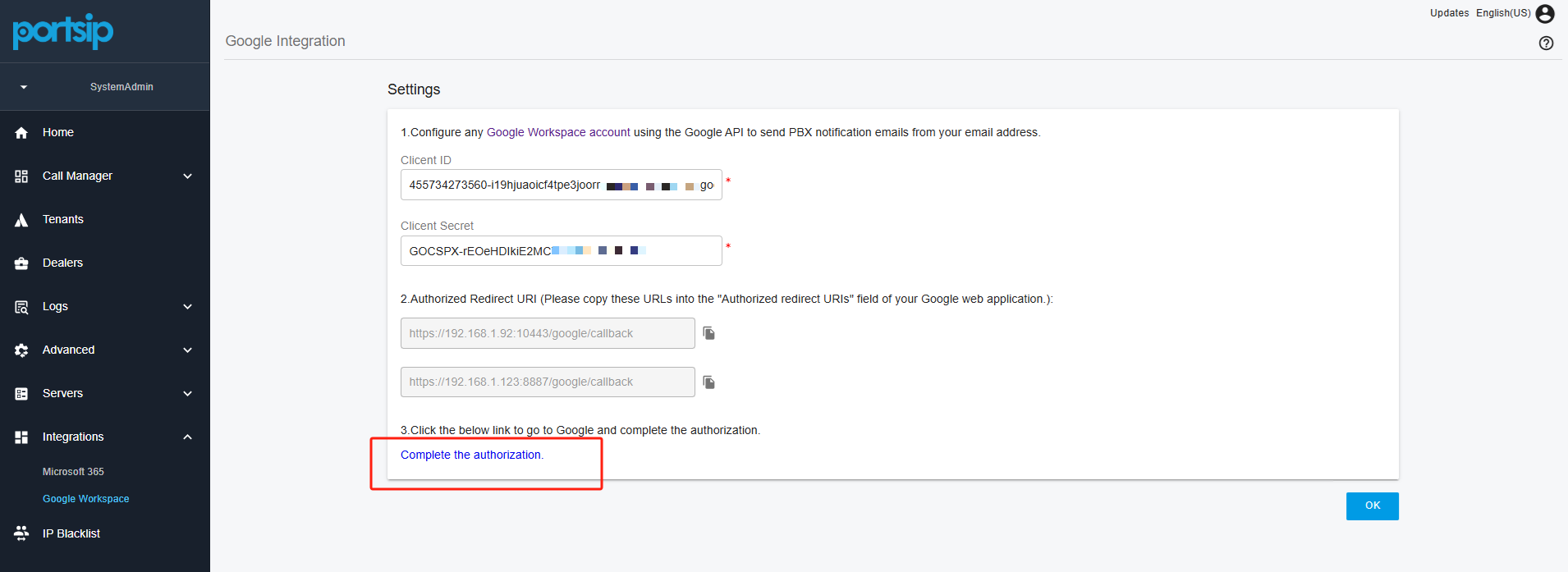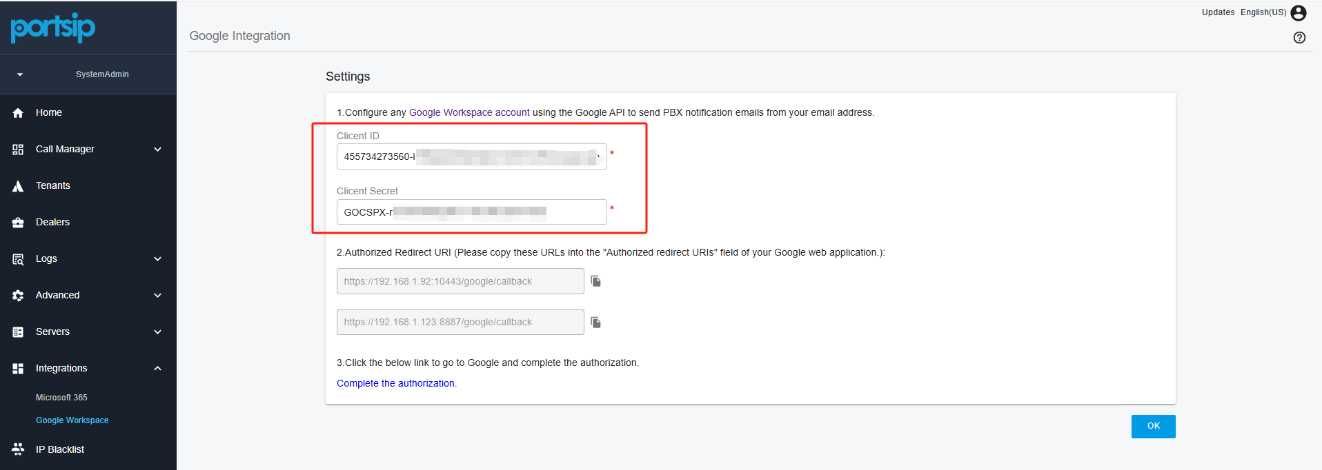 After creating the OAuth client in Google Cloud, configure the integration in PortSIP PBX.