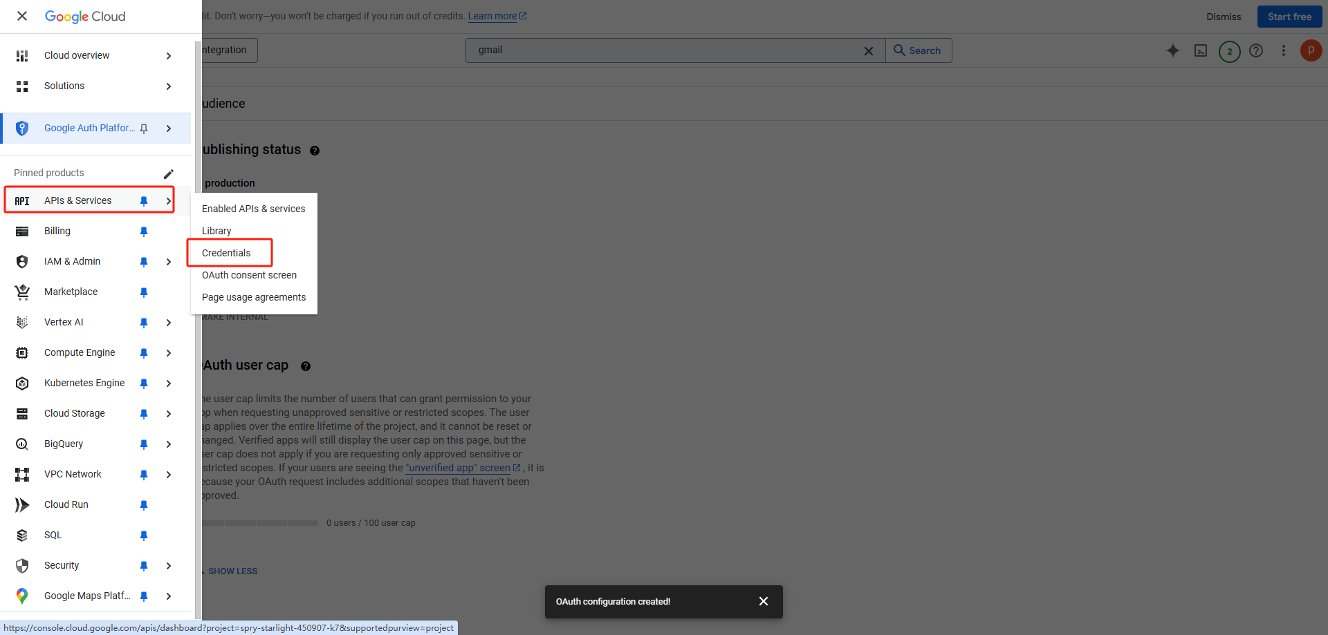 8. Navigate to **APIs & Services → Credentials** in the Google Cloud Console.