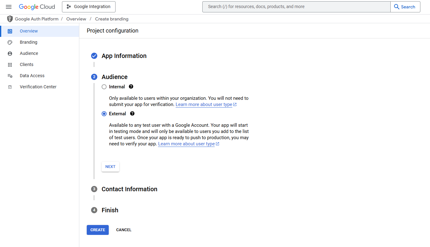 4. Click **Next**, then select the appropriate **Audience** for your application. For example, choose **External.**