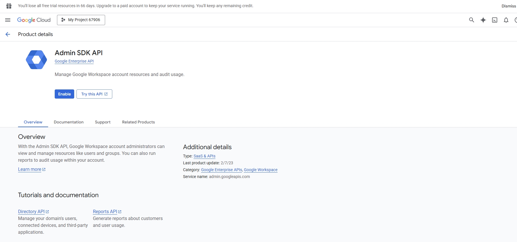 4. On the **Admin SDK API** page, click **ENABLE**.