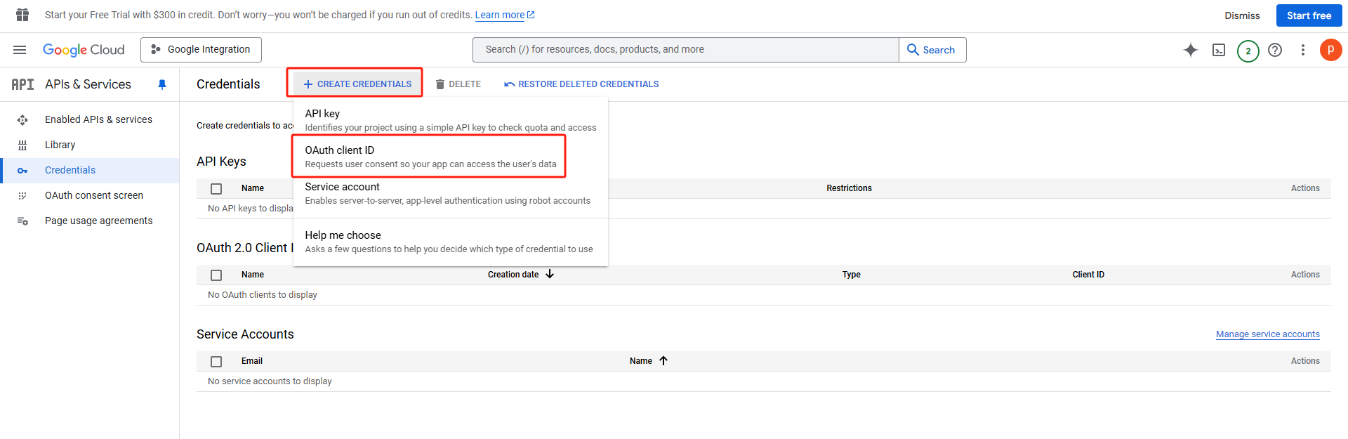 9. Click **+ Create Credentials**, then select **OAuth client ID**.