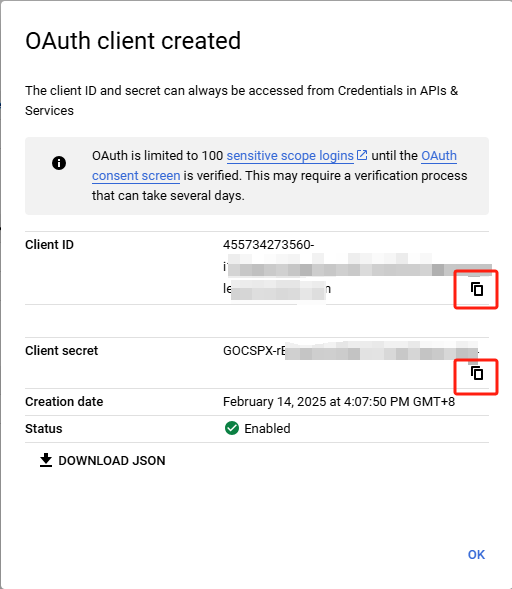 Copy the **Client ID** and **Client Secret**, and store them securely.\