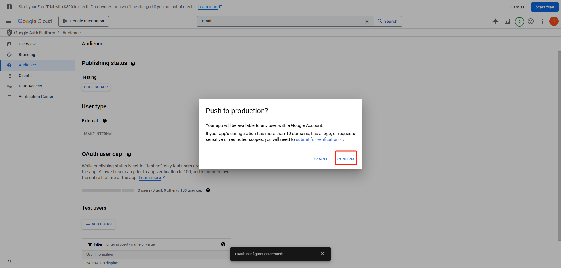 6. If you selected **External** as the Audience in the previous step, you must click **Publish App** after the app is created (see the screenshot below).