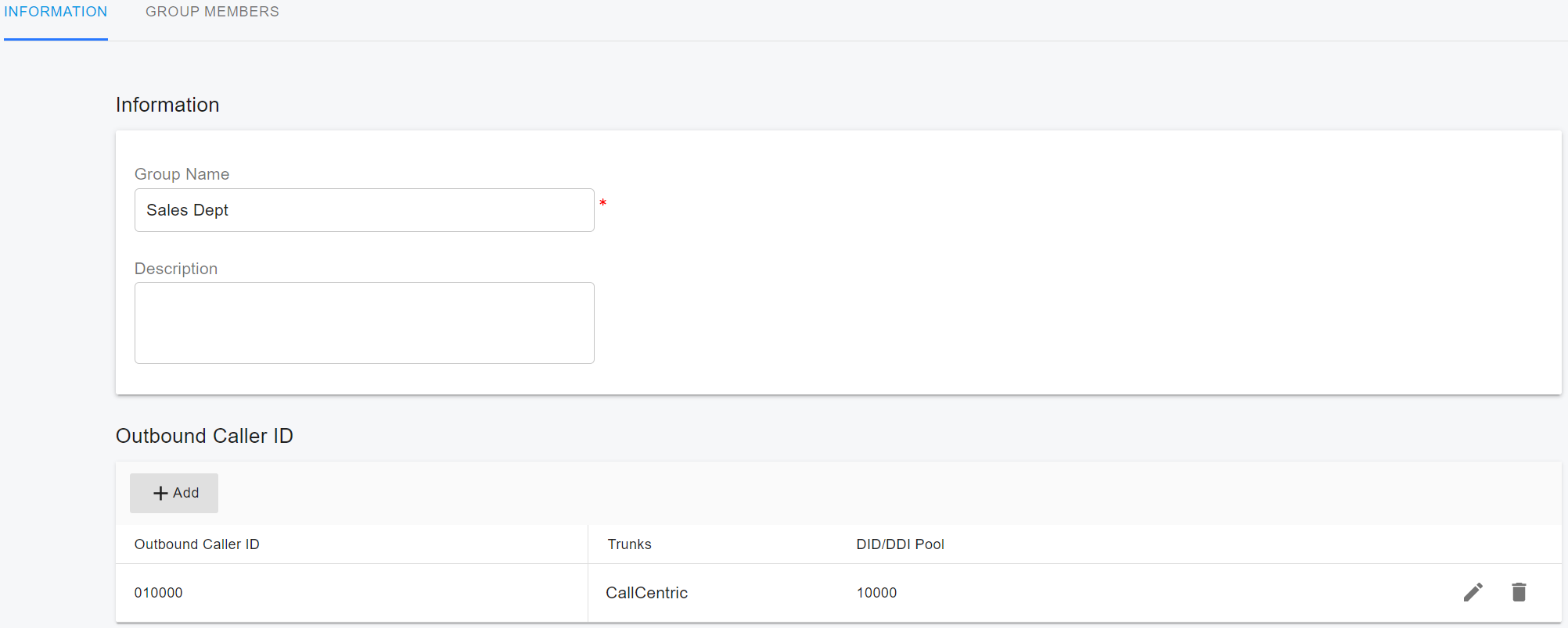 In the example below, a user group named **Sales Dept** is created, with an outbound caller ID of **010000** assigned on the **CallCentric** trunk.