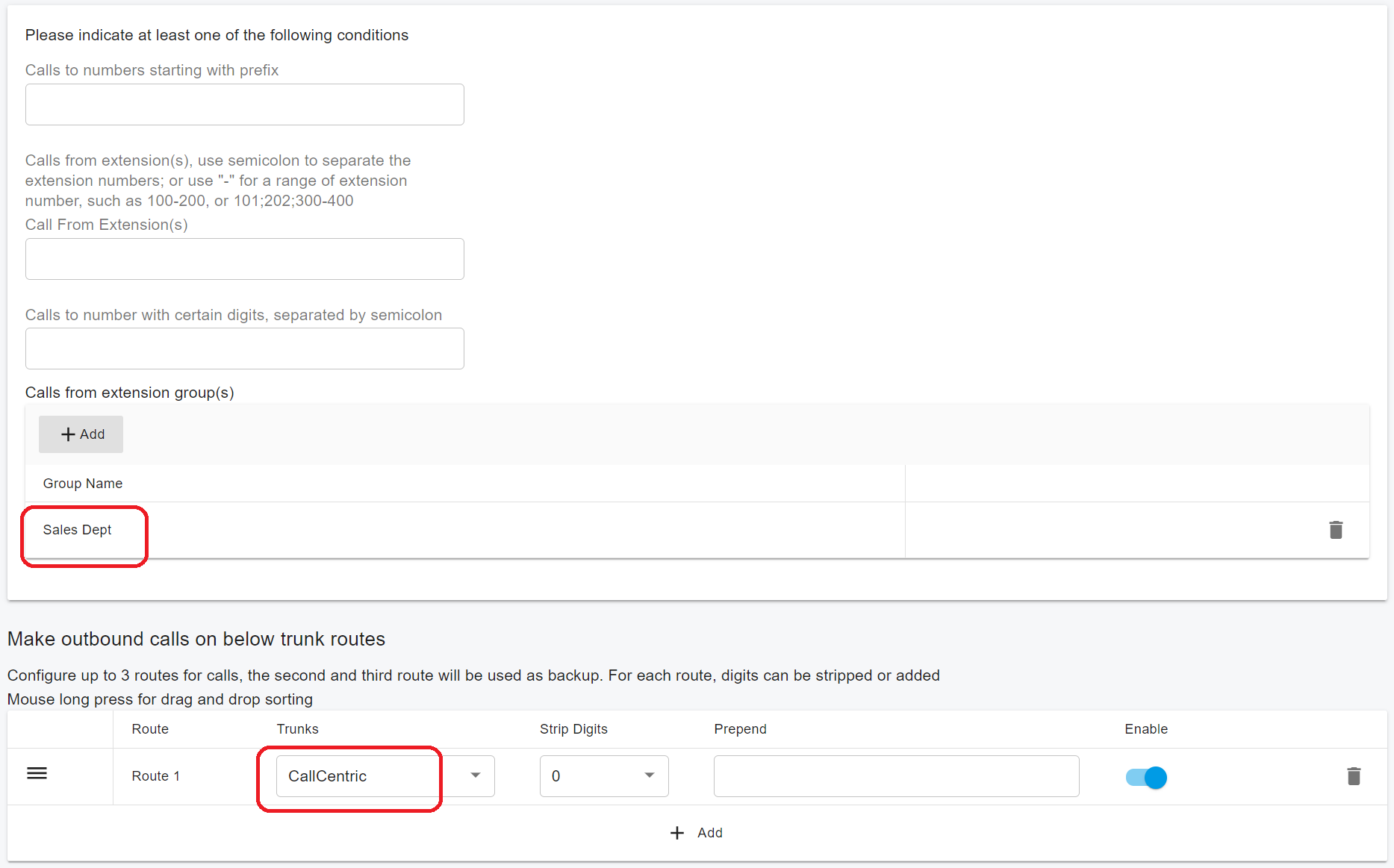 When an extension that belongs to the **Sales Dept** group places a call that matches this outbound rule: