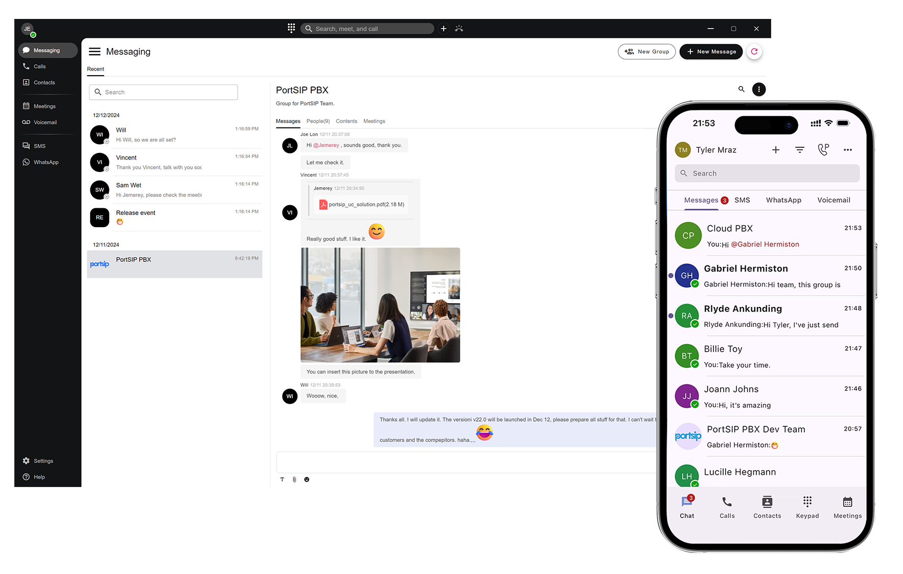 PortSIP ONE is engineered as a comprehensive cloud PBX and UCaaS solution, centralizing calls, video meetings, and SMS/WhatsApp messages into one intuitive application. It connects your team members and clients with exceptional call quality across desktop (Windows, macOS), web browsers, iOS, and Android devices.