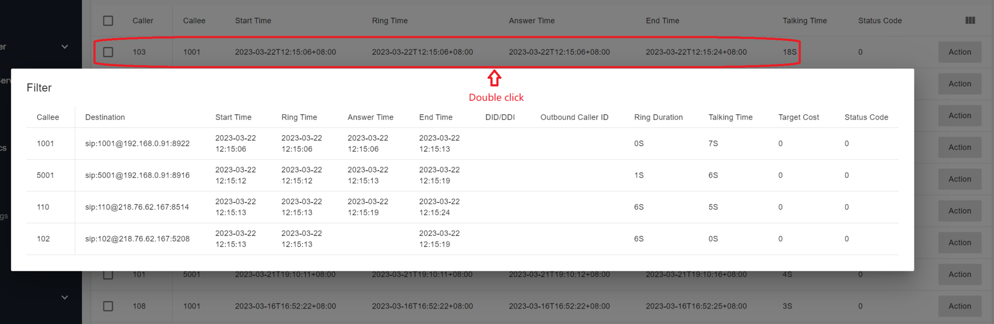 For example, if a call comes from the SIP trunk and arrives at the PBX, then is routed to the IVR and re-routed to the queue by the user pressing DTMF, and an agent of the queue answers that call, all this information(callee number, callee IP address, and port) and timestamp are recorded in the CDR. For more details, please refer to the article on CDR and Call Recording.