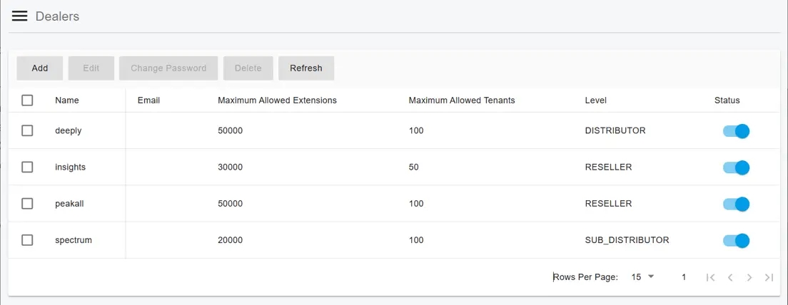 To support this business structure, PortSIP PBX includes a dedicated Dealers feature that enables service providers to easily manage distributors and resellers from within the platform. This feature simplifies partner management while maintaining centralized control over tenants, services, and operations.